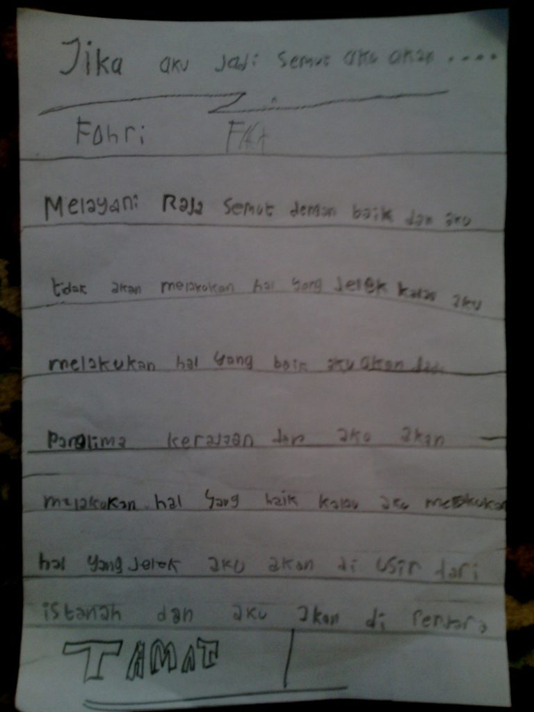 Jika aku jadi semut aku akan melayani raja semut dengan baik dan aku tidak akan melakukan hal yang jelek kalau aku melakukan hal yang baik aku akan jadi panglima kerajaan dan aku akan melakukan hal yang baik kalau aku melakukan hal yang jelek aku akan di usir dari istanah dan aku akan di penjara. (Fahri Wasis Prabowo)