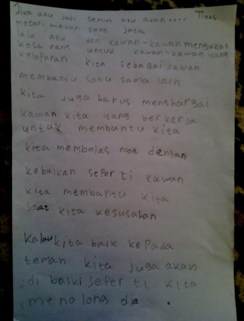 Mencari makan yang jatuh lalu aku dan kawan-kawan mengakat kesarang untuk kawan-kawan yang kelaparan kita sebagai kawan membantu satu sama lain kita juga harus menghargai kawan kita yang bekerja untuk membantu kita kita membalasnya dengan kebaikan seperti kawan kita membantu kita saat kita kesusahan kalau kita baik krpada teman kita juga akan dibaiki seperti kita menolong dia. (Tiyas Harfika Nur Farahim)